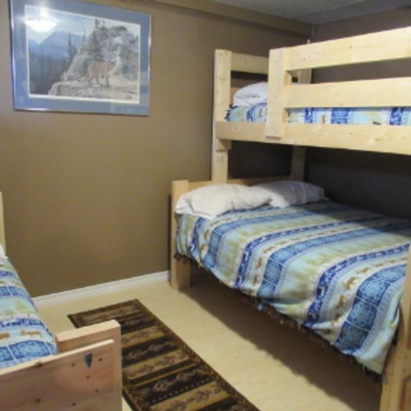 Room #1 is located directly off the lower level family room. There are a set of barn door separating the two rooms. Garden doors lead directly from room #1 outside onto patio area. This room has 2 sets of bunk beds each bed has a double on bottom with a single bed on the top. There is also 2 chairs, a mini fridge and one dresser plus a 3 piece private bathroom with shower. All bedding & towels are provided.