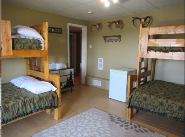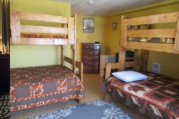 Room #3 is located closest to the outdoor hot tub and has garden doors which lead out to the patio area. This room has 2 sets of bunk beds each bunk bed has a double on bottom with a single bed on the top. There is also a futon, a mini fridge and one dresser plus a 3-piece private bathroom with shower. All bedding & towels are provided.